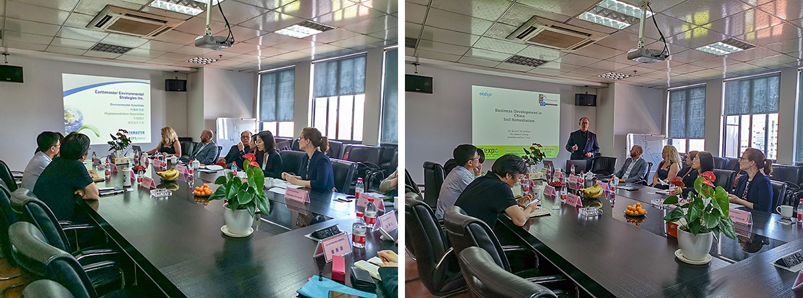 客人也分别介绍了自己公司的情况,Earthmaster业务发展副总裁Amber Flamand介绍该公司是一家专业的环境咨询公司,具有二十余年的发展历史,Earthmaster运营副总裁Adam Dunn详细介绍了公司的主打技术——PEPSystems植物复育法及运用该技术成功修复污染土壤的工程案例。McMillian-McGee总裁Bruce McGee介绍McMillian-McGee是一家专注原位热脱附修复技术的企业,自主研发了多套专利技术进行污染土壤的原位热脱附修复,并在全球范围内获得广泛使用。最后,博世华团队分别就植物修复和原位热脱附技术与来访公司进行了交流和讨论。
